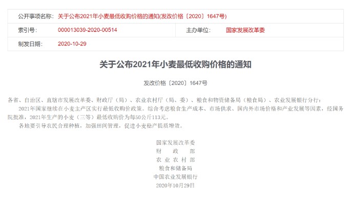 關(guān)于2021年小麥最低收購價有關(guān)政策的通知各省、自治區(qū)、直轄市發(fā)展改革委、糧食和物資儲備局(糧食局)、財政廳(局)、農(nóng)業(yè)農(nóng)村廳(局、委)、農(nóng)業(yè)發(fā)展銀行分行,中國儲備糧管理集團有限公司、中糧集團有限公司、中國供銷集團有限公司、中國中化集團有限公司:為保障國家糧食安全,進一步完善糧食最低收購價政策,2021年繼續(xù)對最低收購價小麥限定收購總量?,F(xiàn)將具體事項通知如下。根據(jù)近幾年小麥最低收購價收購數(shù)量,限定2021年最低收購價小麥?zhǔn)召徔偭繛?700萬噸。(一)分批下達。限定收購總量分兩批次下達,第一批數(shù)量為3330萬噸,不分配到??;第二批數(shù)量為370萬噸,視收購需要具體分配到省。當(dāng)最低收購價全國收購總量達到第一批數(shù)量的90%時,中儲糧有關(guān)分公司應(yīng)會同省級糧食等部門單位及時提出本省第二批收購的計劃數(shù)量建議。中儲糧集團公司根據(jù)當(dāng)年小麥產(chǎn)量、收購量、農(nóng)戶余糧和市場價格等情況統(tǒng)籌平衡各省數(shù)量后,報國家糧食和物資儲備局批準(zhǔn)。國家糧食和物資儲備局通過政府網(wǎng)站公布各省第二批收購數(shù)量。在第一批收購?fù)瓿珊螅嘘P(guān)省份按照批準(zhǔn)的第二批數(shù)量繼續(xù)開展收購。當(dāng)收購量達到本省批準(zhǔn)數(shù)量時,立即停止該省最低收購價收購且不再啟動。(二)動態(tài)監(jiān)測。啟動最低收購價執(zhí)行預(yù)案后,中儲糧集團公司要嚴(yán)格按照預(yù)案有關(guān)規(guī)定,加強統(tǒng)計監(jiān)測,每五日向國家糧食和物資儲備局報送收購進度;啟動第二批收購后,中儲糧集團公司要按日報送收購進度。國家糧食和物資儲備局定期通過政府網(wǎng)站公布最低收購價全國收購總量。省級糧食等有關(guān)部門要結(jié)合小麥商品量和農(nóng)戶余糧情況,及時開展調(diào)研調(diào)度,全面掌握收糧進度。(一)認(rèn)真落實限量收購政策。中儲糧集團公司作為最低收購價政策執(zhí)行主體,要嚴(yán)格執(zhí)行限定收購總量的收購政策,不得超量收購。財政資金支持限于最低收購價政策下的最高收購總量內(nèi)。(二)加強市場監(jiān)管。各地要認(rèn)真落實糧食收儲制度改革精神,規(guī)范糧食流通市場秩序,依法依規(guī)嚴(yán)厲查處糧食收儲過程中的違法違規(guī)行為。(三)促進“優(yōu)糧優(yōu)價”。各地要積極鼓勵農(nóng)企對接,充分發(fā)揮市場價格對生產(chǎn)的反饋引導(dǎo)作用,促進種植結(jié)構(gòu)調(diào)整優(yōu)化,增加綠色優(yōu)質(zhì)安全產(chǎn)品供給。