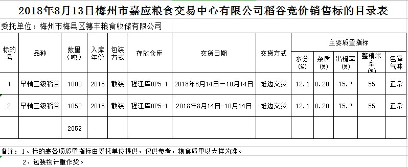 受客戶委托,梅州市嘉應(yīng)糧食交易中心有限公司定于2018年8月13日(星期一)舉辦糧食競(jìng)價(jià)交易會(huì),梅州市梅縣區(qū)穗豐糧食收儲(chǔ)有限公司擬銷售2015年早秈稻2052噸。