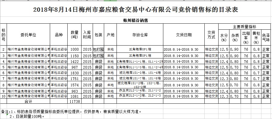 交易時間和地點:2018年8月14日(星期二)上午10時。廣東省梅州市彬芳大道南161號梅州市糧食交易中心3樓。