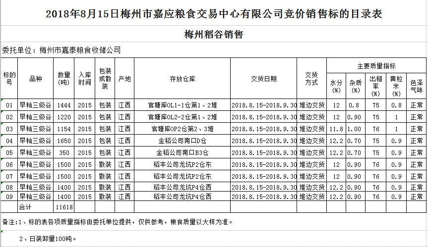 受客戶委托,梅州市嘉應(yīng)糧食交易中心有限公司定于2018年8月15日(星期三)舉辦糧食競(jìng)價(jià)交易會(huì),梅州市嘉泰糧食收儲(chǔ)公司擬銷(xiāo)售早秈稻11618噸。