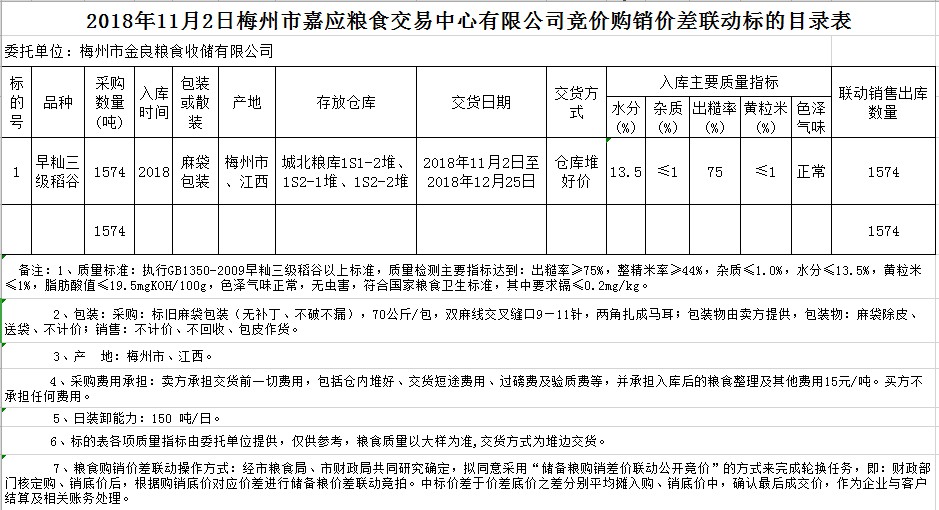受客戶(hù)委托,梅州市嘉應(yīng)糧食交易中心有限公司定于2018年11月2日(星期五)舉辦稻谷購(gòu)銷(xiāo)價(jià)差聯(lián)動(dòng)標(biāo)的交易會(huì),梅州市金良糧食收儲(chǔ)有限公司擬銷(xiāo)售和采購(gòu)早秈稻1574噸。