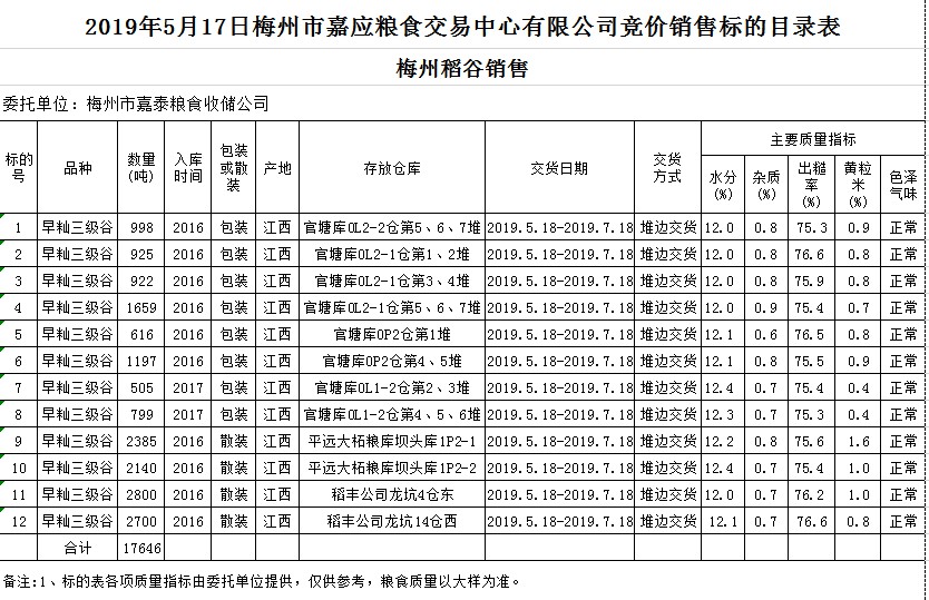 受客戶委托,梅州市嘉應(yīng)糧食交易中心有限公司定于2019年5月17日(星期五)舉辦糧食競價(jià)交易會,梅州市嘉泰糧食收儲公司擬銷售2016年、2017年早秈稻17646噸。