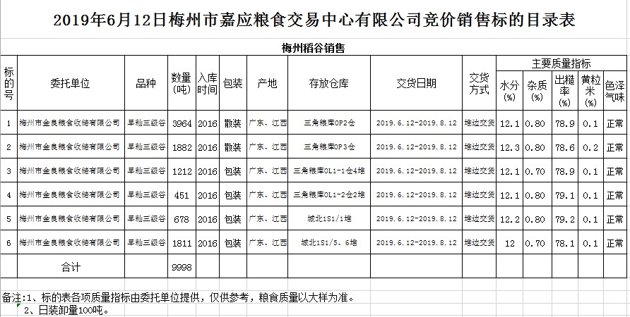 受客戶委托,梅州市嘉應糧食交易中心有限公司定于2019年6月12日(星期三)舉辦糧食競價交易會,梅州市金良糧食收儲有限公司擬銷售早秈稻9998噸。