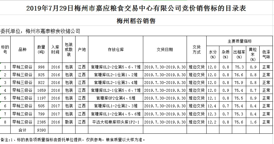 受客戶委托,梅州市嘉應(yīng)糧食交易中心有限公司定于2019年7月29日(星期一)舉辦糧食競價(jià)交易會(huì),梅州市嘉泰糧食收儲(chǔ)公司擬銷售2016年、2017年早秈稻9390噸。