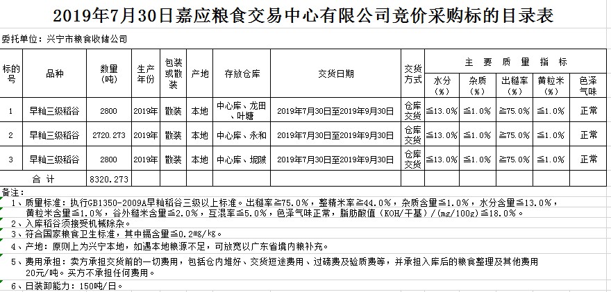 受客戶委托,梅州市嘉應(yīng)糧食交易中心有限公司定于20197月30日(星期二)舉辦糧食競價(jià)交易會(huì),興寧市糧食收儲公司擬采購2019年早秈稻8320.273噸。