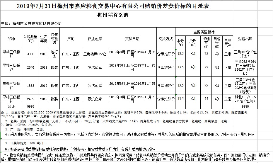 交易時(shí)間和地點(diǎn):2019年7月31日(星期三)上午10時(shí)。廣東省梅州市彬芳大道南161號梅州市糧食交易中心3樓。
