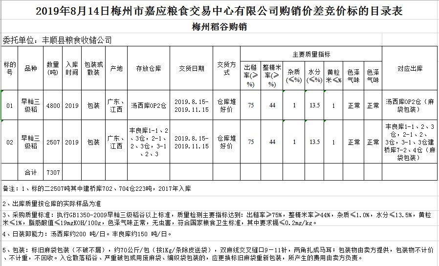 受客戶委托,梅州市嘉應(yīng)糧食交易中心有限公司定于20198月14日(星期三)舉辦稻谷購(gòu)銷價(jià)差聯(lián)動(dòng)標(biāo)的交易會(huì),豐順縣糧食收儲(chǔ)公司擬銷售和采購(gòu)早秈稻7307噸。