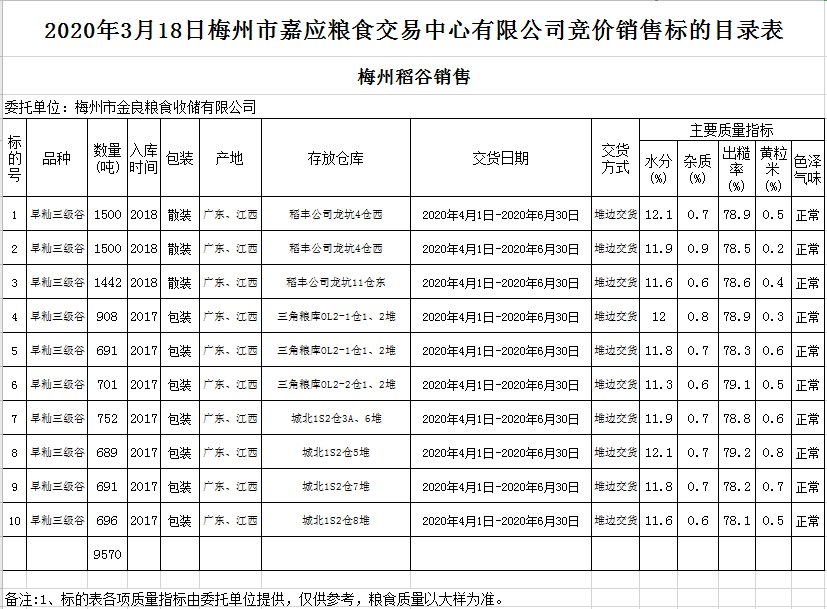 受客戶委托,梅州市嘉應(yīng)糧食交易中心有限公司定于2020年3月18日(星期三)舉辦糧食競(jìng)價(jià)交易會(huì),梅州市金良糧食收儲(chǔ)有限公司擬銷售2017年、2018年早秈稻9570噸。
