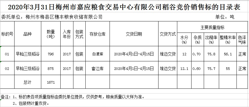 2020年3月31日梅州市梅縣區(qū)穗豐糧食收儲(chǔ)有限公司稻谷銷售