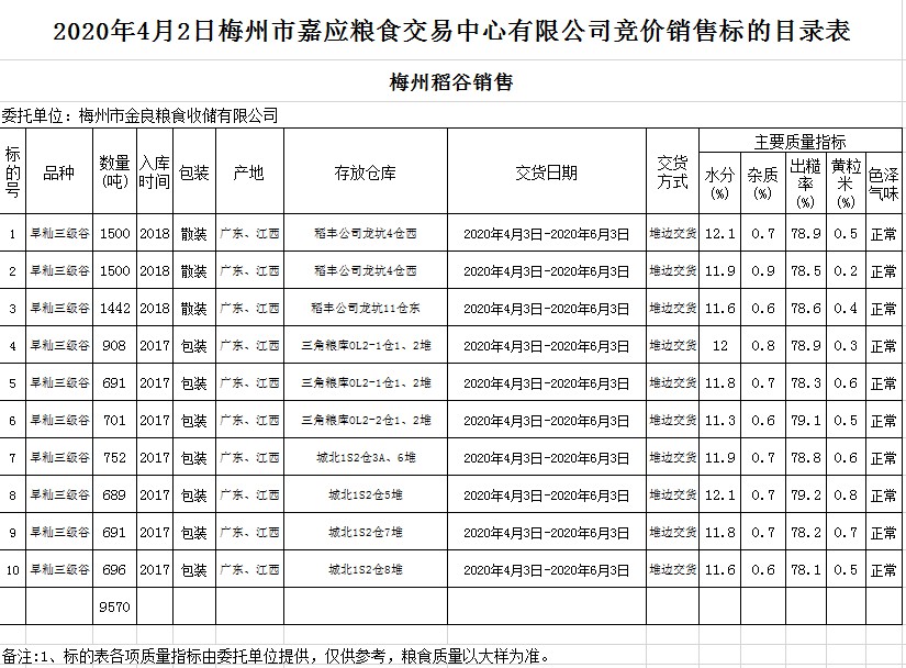 2020年4月2日梅州市金良糧食收儲(chǔ)有限公司稻谷銷售