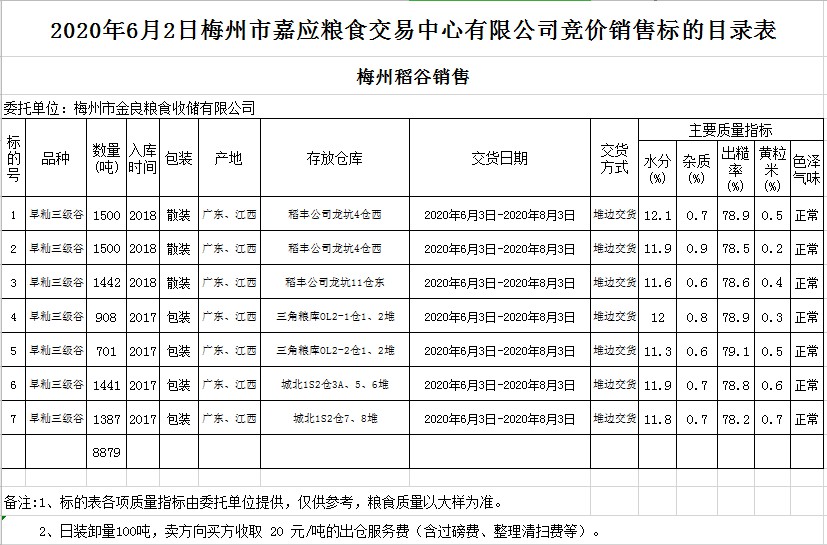 2020年6月2日梅州市金良糧食收儲(chǔ)有限公司稻谷銷售