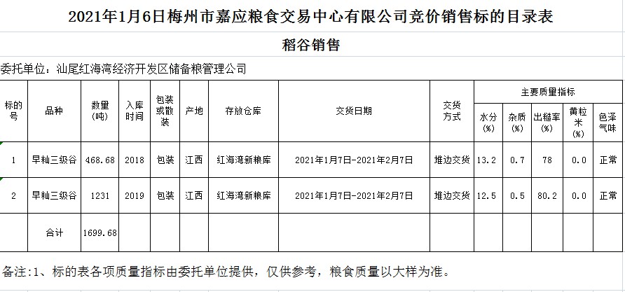 交易時間和地點:2021年1月6日(星期三)上午10時。廣東省梅州市彬芳大道南161號梅州市糧食交易中心3樓。