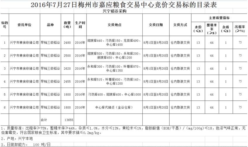 受客戶委托,梅州市嘉應(yīng)糧食交易中心有限公司定于2016727日舉辦糧食競(jìng)價(jià)交易會(huì),興寧市糧食收儲(chǔ)公司擬采購(gòu)2016年產(chǎn) 興寧本地早秈三級(jí)稻谷13655噸。