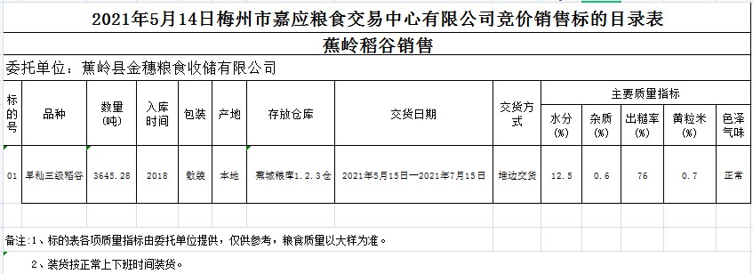 受客戶委托,梅州市嘉應(yīng)糧食交易中心有限公司定于2021年5月14日(星期五)舉辦糧食競價(jià)交易會(huì)。蕉嶺縣金穗糧食收儲(chǔ)有限公司擬銷售2018年早秈稻3645.28噸。