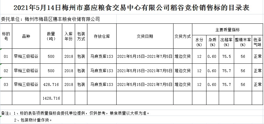 受客戶委托,梅州市嘉應(yīng)糧食交易中心有限公司定于2021年5月14日(星期五)舉辦糧食競價(jià)交易會(huì)。梅州市梅縣區(qū)穗豐糧食收儲有限公司擬銷售2018年早秈稻1428.716噸。