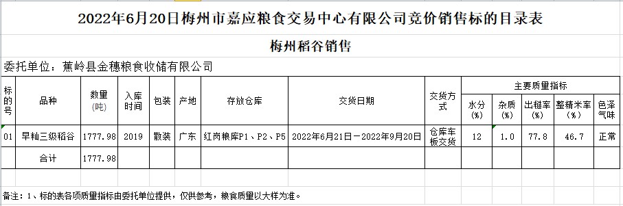 受客戶委托,梅州市嘉應(yīng)糧食交易中心有限公司定于2022年6月20日(星期一)舉辦糧食競(jìng)價(jià)交易會(huì)。蕉嶺縣金穗糧食收儲(chǔ)有限公司擬銷售2019年早秈稻1777.98噸。
