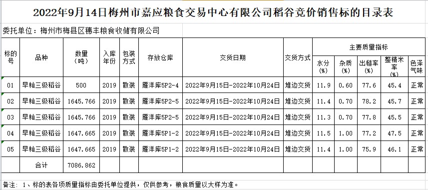 受客戶委托,梅州市嘉應(yīng)糧食交易中心有限公司定于2022年9月14日(星期三)舉辦糧食競(jìng)價(jià)交易會(huì)。梅州市梅縣區(qū)穗豐糧食收儲(chǔ)有限公司擬銷售2019年早秈稻7086.862噸。