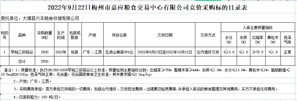2022年9月22日大埔縣興豐糧食收儲有限公司稻谷采購