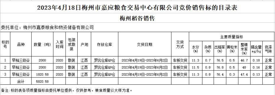 受客戶(hù)委托,梅州市嘉應(yīng)糧食交易中心有限公司定于2023年4月18日(星期二)舉辦糧食競(jìng)價(jià)交易會(huì)。梅州市嘉泰糧食和物資儲(chǔ)備有限公司擬銷(xiāo)售2020年早秈稻5820.58噸。