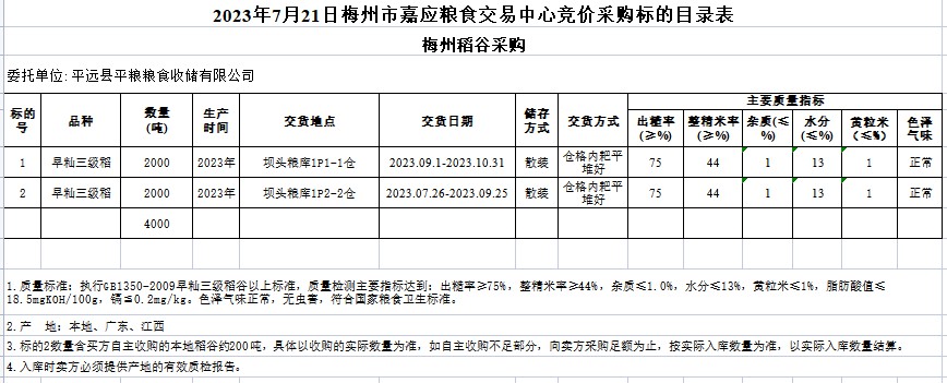 受客戶委托,梅州市嘉應(yīng)糧食交易中心有限公司定于2023年7月21日(星期五)舉辦糧食競(jìng)價(jià)交易會(huì)。平遠(yuǎn)縣平糧糧食收儲(chǔ)有限公司擬采購(gòu)2023年早秈稻4000噸。