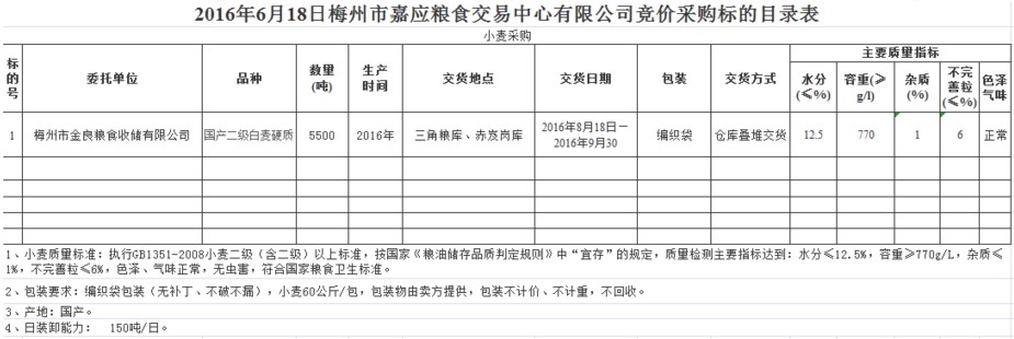 2016年8月18日梅州市金良糧食收儲有限公司小麥采購