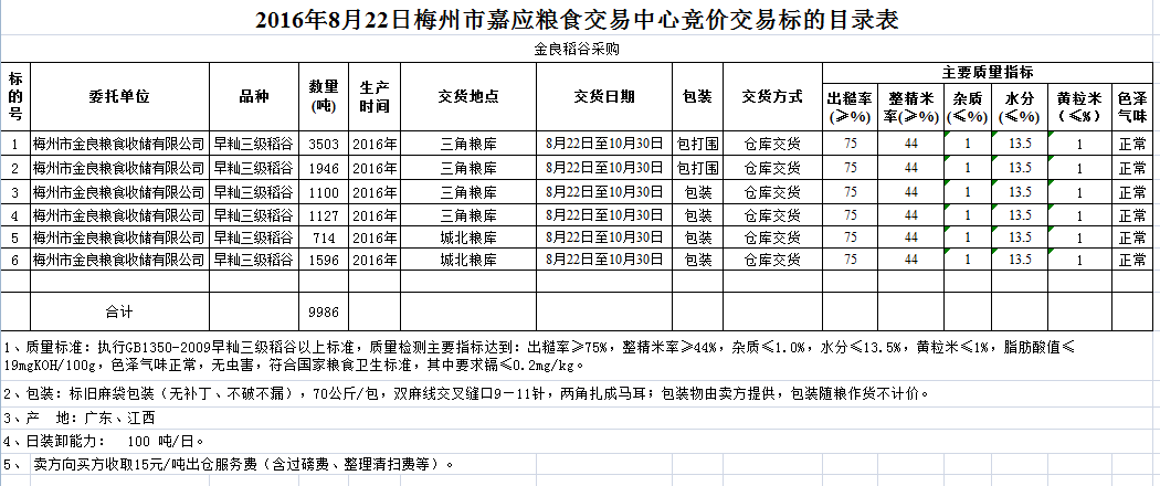 2016年8月22日梅州市金良糧食收儲有限公司稻谷采購