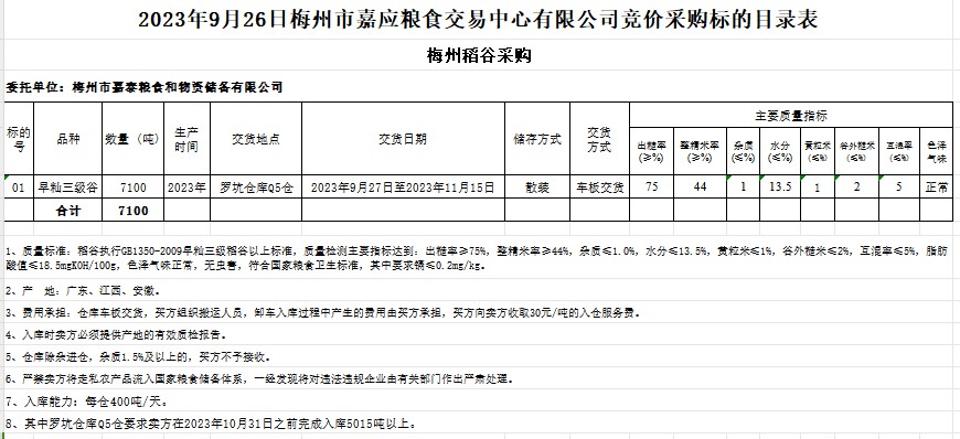 受客戶委托,梅州市嘉應糧食交易中心有限公司定于2023年9月26日(星期二)舉辦糧食競價交易會。梅州市嘉泰糧食和物資儲備有限公司擬采購2023年早秈稻谷7100噸。