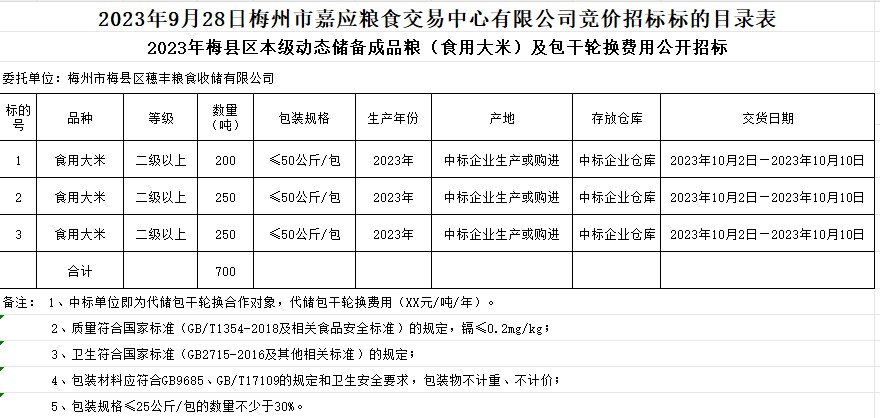 梅縣區(qū)2023年本級(jí)動(dòng)態(tài)儲(chǔ)備成品糧采購(gòu)及包干輪換費(fèi)用公開招投標(biāo)公告