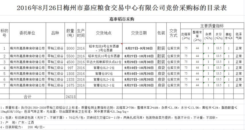 2016年8月26日梅州市嘉泰糧食收儲公司稻谷采購