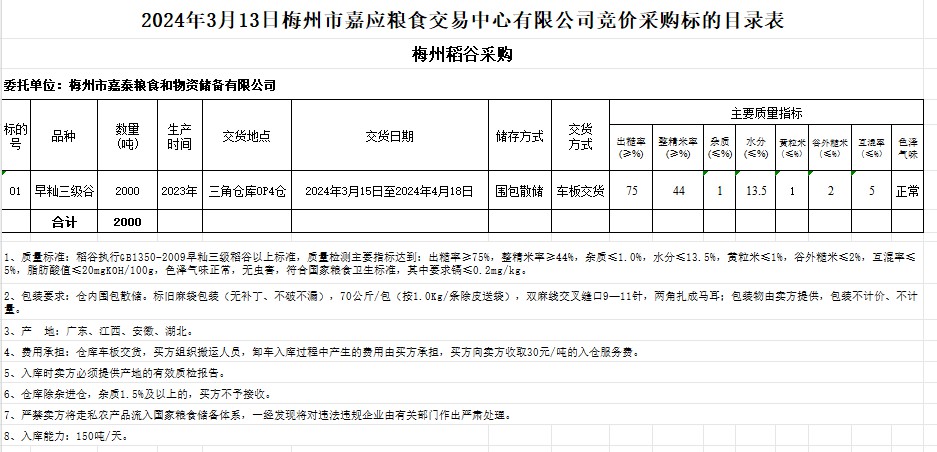 受客戶委托,梅州市嘉應糧食交易中心有限公司定于2024年3月13日(星期三)舉辦糧食競價交易會。梅州市嘉泰糧食和物資儲備有限公司擬采購2023年早秈稻2000噸。