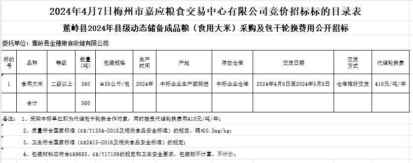 蕉嶺縣2024年縣級動態(tài)儲備成品糧(食用大米)采購及包干輪換費用公開招標(biāo)公告