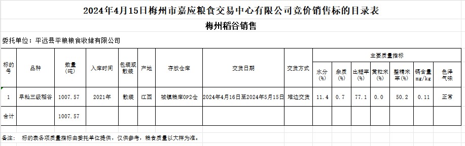 受客戶(hù)委托,梅州市嘉應(yīng)糧食交易中心有限公司定于2024年4月15日(星期一)舉辦糧食競(jìng)價(jià)交易會(huì)。平遠(yuǎn)縣平糧糧食收儲(chǔ)有限公司擬銷(xiāo)售2021年產(chǎn)早秈稻1007.57噸。