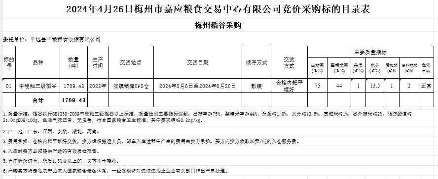 受客戶委托,梅州市嘉應(yīng)糧食交易中心有限公司定于2024年4月26日(星期五)舉辦糧食競價交易會。平遠縣平糧糧食收儲有限公司擬采購2023年產(chǎn)中晚秈稻谷1709.43噸。