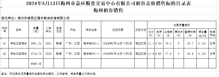 受客戶委托,梅州市嘉應糧食交易中心有限公司定于2024年5月13日(星期一)舉辦糧食競價交易會。梅州市梅縣區(qū)穗豐糧食收儲有限公司擬銷售2021年、2022年產早秈稻6696.08噸。