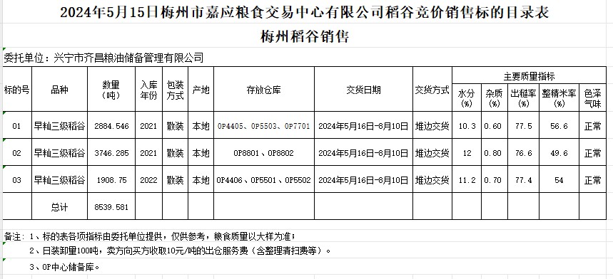 受客戶委托,梅州市嘉應糧食交易中心有限公司定于2024年5月15日(星期三)舉辦糧食競價交易會。興寧市齊昌糧油儲備管理有限公司擬銷售2021年、2022年產早秈稻8539.581噸。