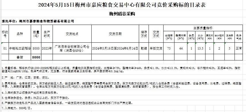 受客戶委托,梅州市嘉應(yīng)糧食交易中心有限公司定于2024年5月15日(星期三)舉辦糧食競價(jià)交易會(huì)。梅州市嘉泰糧食和物資儲(chǔ)備有限公司擬采購2023年產(chǎn)中晚秈稻谷8000噸。