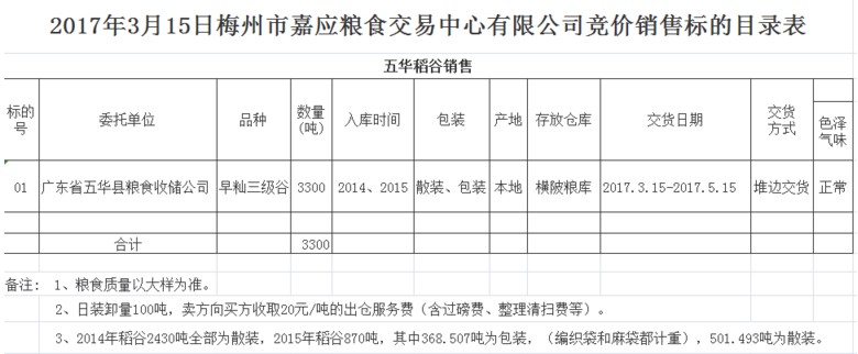 2017年3月15日廣東省五華縣糧食收儲(chǔ)公司稻谷銷售