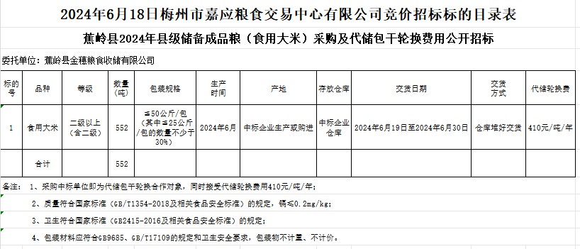 受客戶委托,梅州市嘉應(yīng)糧食交易中心有限公司定于2024年6月18日(星期二)上午10時在廣東省梅州市彬芳大道南161號梅州市糧食交易中心3樓,舉辦蕉嶺縣2024年縣級儲備成品糧(食用大米)采購及代儲包干輪換費(fèi)用公開招標(biāo)。