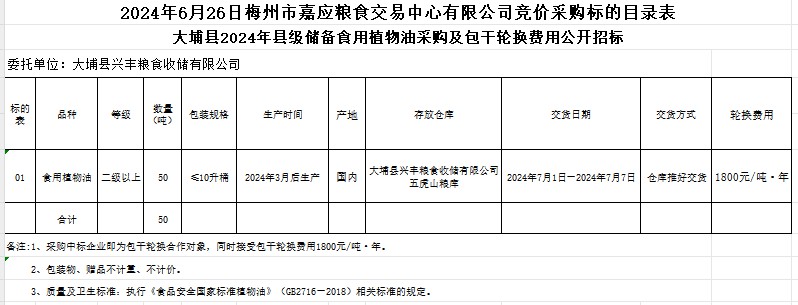受大埔縣興豐糧食收儲(chǔ)有限公司委托,梅州市嘉應(yīng)糧食交易中心有限公司定于2024年6月26日(星期三)上午10時(shí)在廣東省梅州市彬芳大道南161號(hào)梅州市糧食交易中心3樓,舉辦大埔縣2024年縣級(jí)儲(chǔ)備食用植物油采購(gòu)及包干輪換費(fèi)用公開(kāi)招標(biāo)。