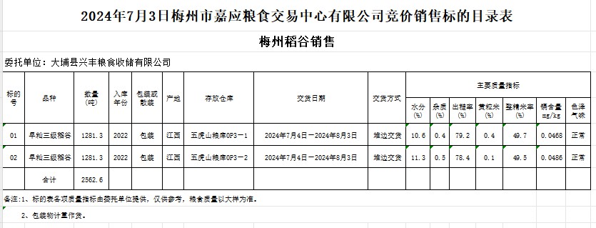 受客戶委托,梅州市嘉應(yīng)糧食交易中心有限公司定于2024年7月3日(星期三)舉辦糧食競價(jià)交易會。大埔縣興豐糧食收儲有限公司擬銷售2022年產(chǎn)早秈稻谷2562.6噸。