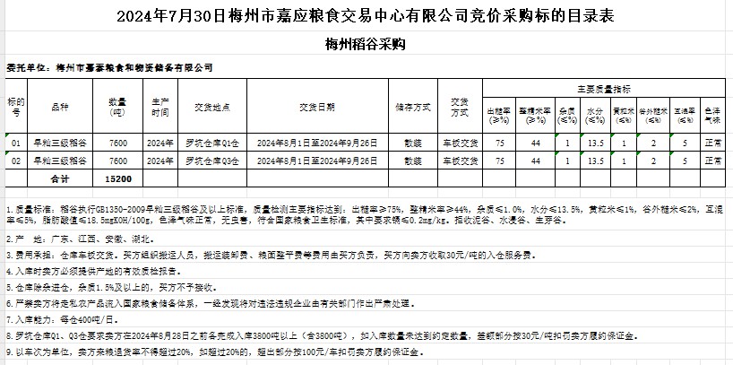 受客戶委托,梅州市嘉應(yīng)糧食交易中心有限公司定于2024年7月30日(星期二)舉辦糧食競(jìng)價(jià)交易會(huì)。梅州市嘉泰糧食和物資儲(chǔ)備有限公司擬采購(gòu)2024年產(chǎn)早秈稻15200噸。