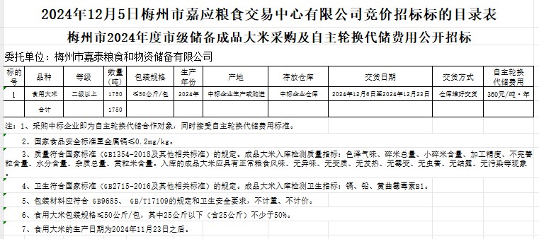 文件下載:2024年12月5日梅州市2024年度市級儲備成品大米采購及自主輪換代儲費(fèi)用公開招標(biāo)公告