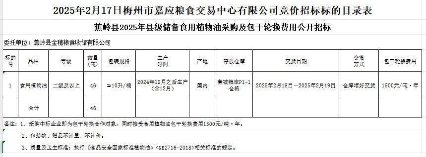文件下載:2025年2月17日蕉嶺縣2025年縣級(jí)儲(chǔ)備食用植物油采購及包干輪換費(fèi)用公開招標(biāo)公告