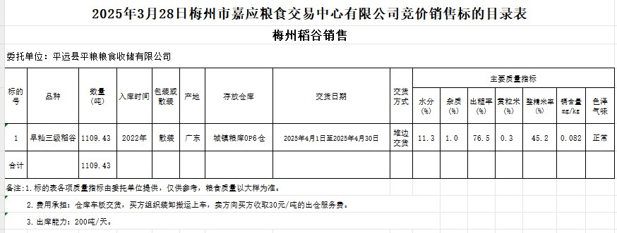 受客戶委托,梅州市嘉應(yīng)糧食交易中心有限公司定于2025年3月28日(星期五)舉辦糧食競價交易會。平遠(yuǎn)縣平糧糧食收儲有限公司擬銷售2022年產(chǎn)早秈稻1109.43噸。