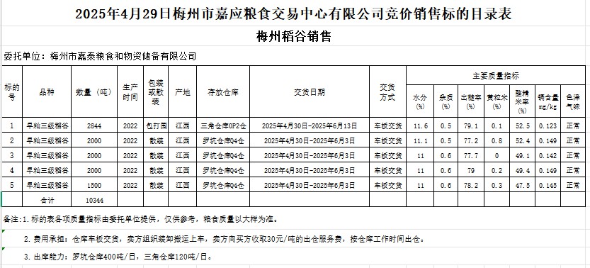受客戶委托,梅州市嘉應(yīng)糧食交易中心有限公司定于2025年4月29日(星期二)舉辦糧食競價交易會。梅州市嘉泰糧食和物資儲備有限公司擬銷售2022年產(chǎn)早秈稻谷10344噸。