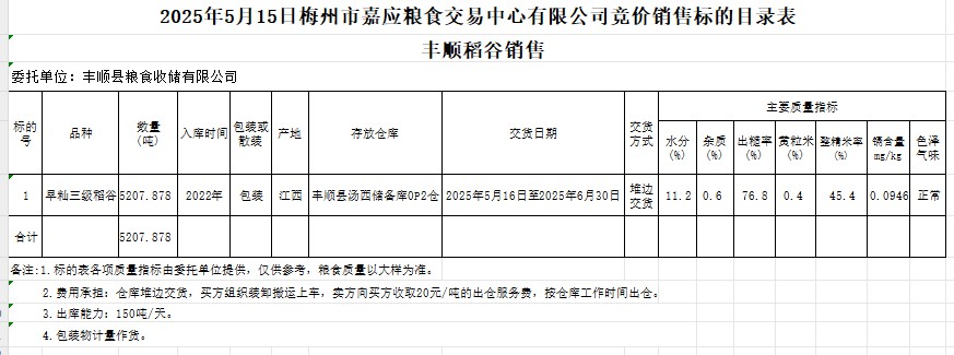 2025年5月15日豐順縣糧食收儲(chǔ)有限公司稻谷銷售