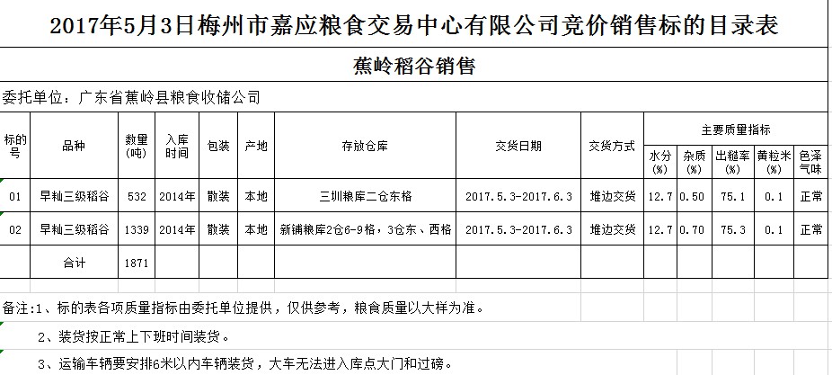 2017年5月3日廣東省蕉嶺縣糧食收儲公司稻谷銷售