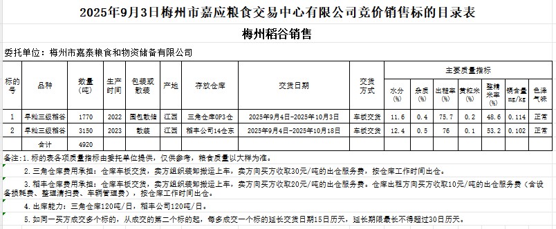 2025年9月3日梅州市嘉泰糧食和物資儲備有限公司稻谷銷售