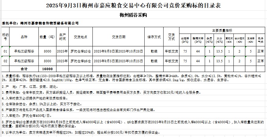 受客戶委托,梅州市嘉應(yīng)糧食交易中心有限公司定于2025年9月3日(星期三)舉辦糧食競(jìng)價(jià)交易會(huì)。梅州市嘉泰糧食和物資儲(chǔ)備有限公司擬采購(gòu)2025年產(chǎn)早秈稻谷16000噸。