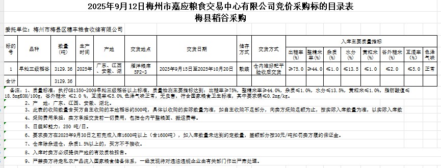 2025年9月12日梅州市梅縣區(qū)穗豐糧食收儲(chǔ)有限公司稻谷采購(gòu)